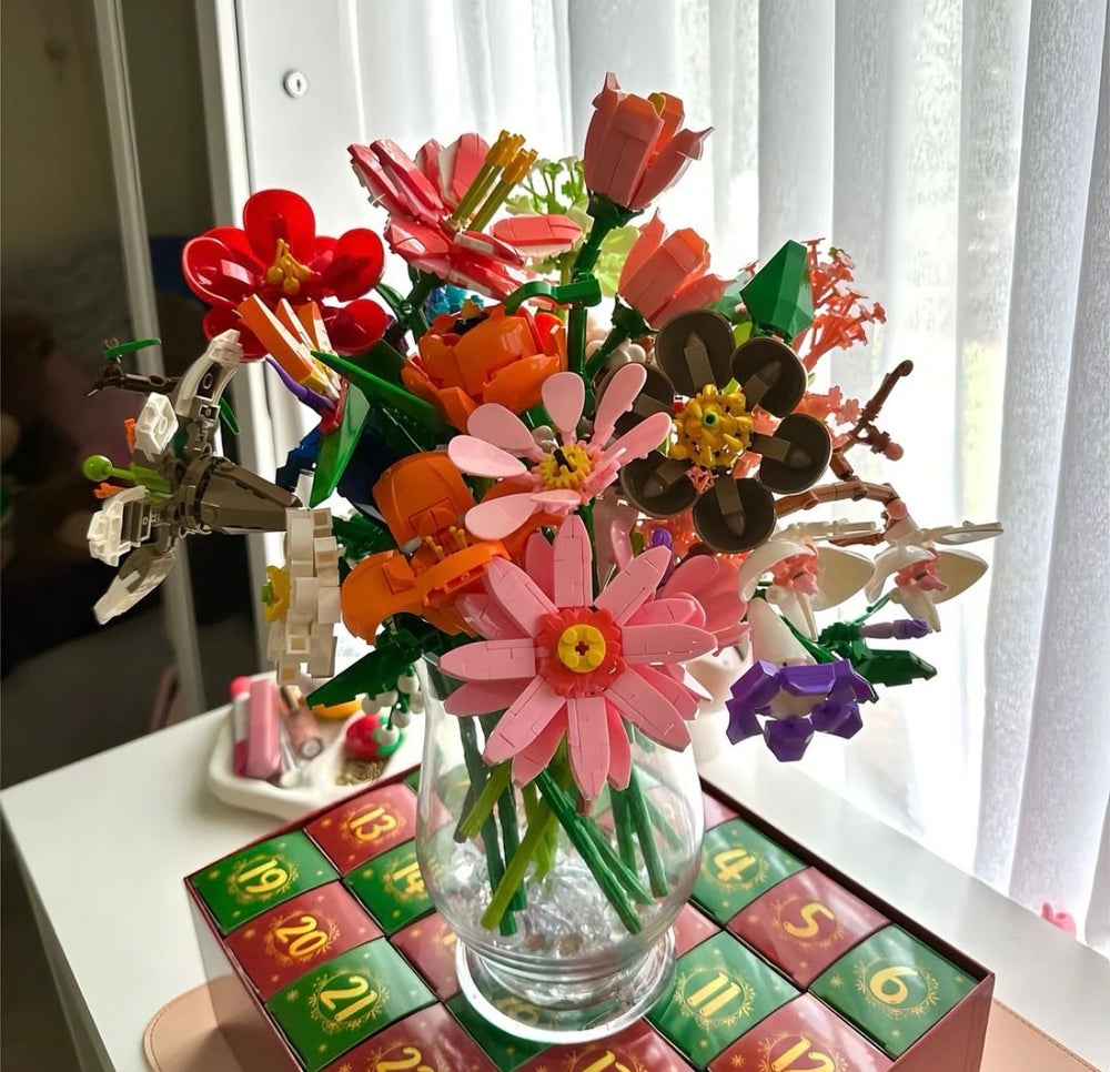 Contrairement aux calendriers de l’Avent traditionnels, les fleurs de cet ensemble peuvent être exposées toute l’année. Chaque jour ajoute une petite construction au bouquet final que vous pouvez garder pour toujours — un cadeau de Noël mémorable.